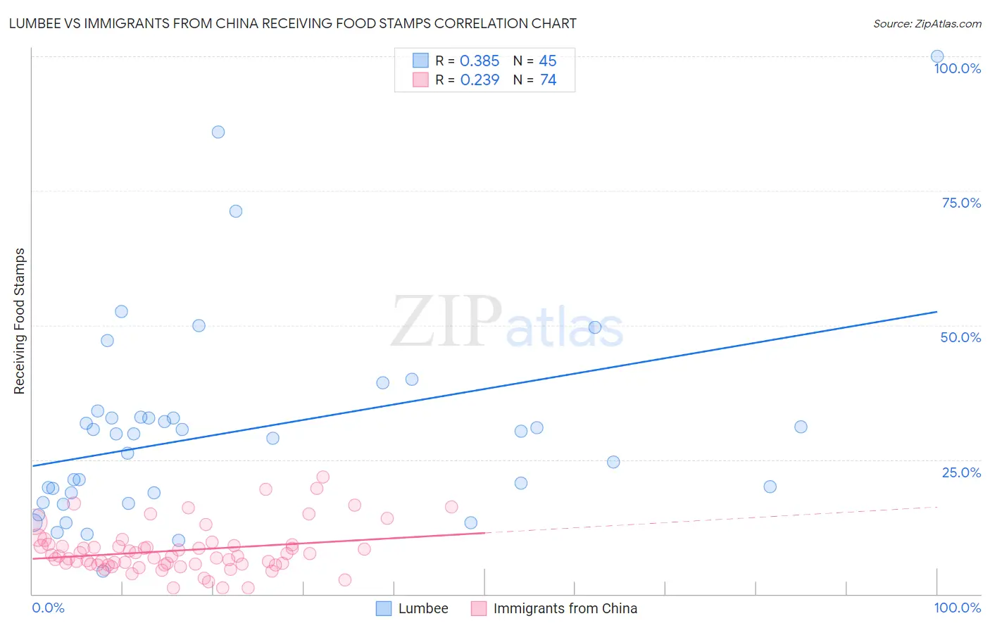 Lumbee vs Immigrants from China Receiving Food Stamps Correlation Chart