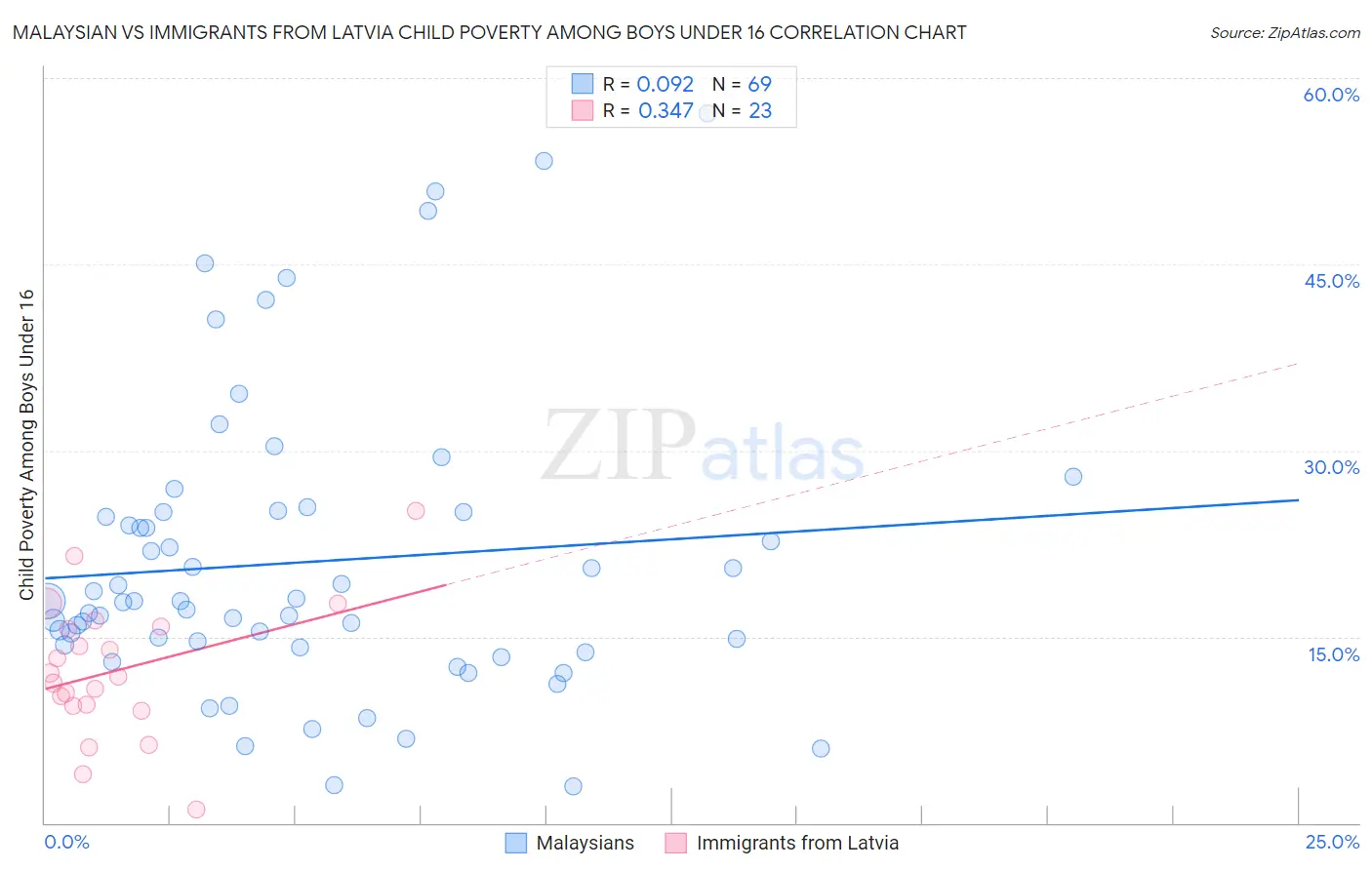 Malaysian vs Immigrants from Latvia Child Poverty Among Boys Under 16 Correlation Chart