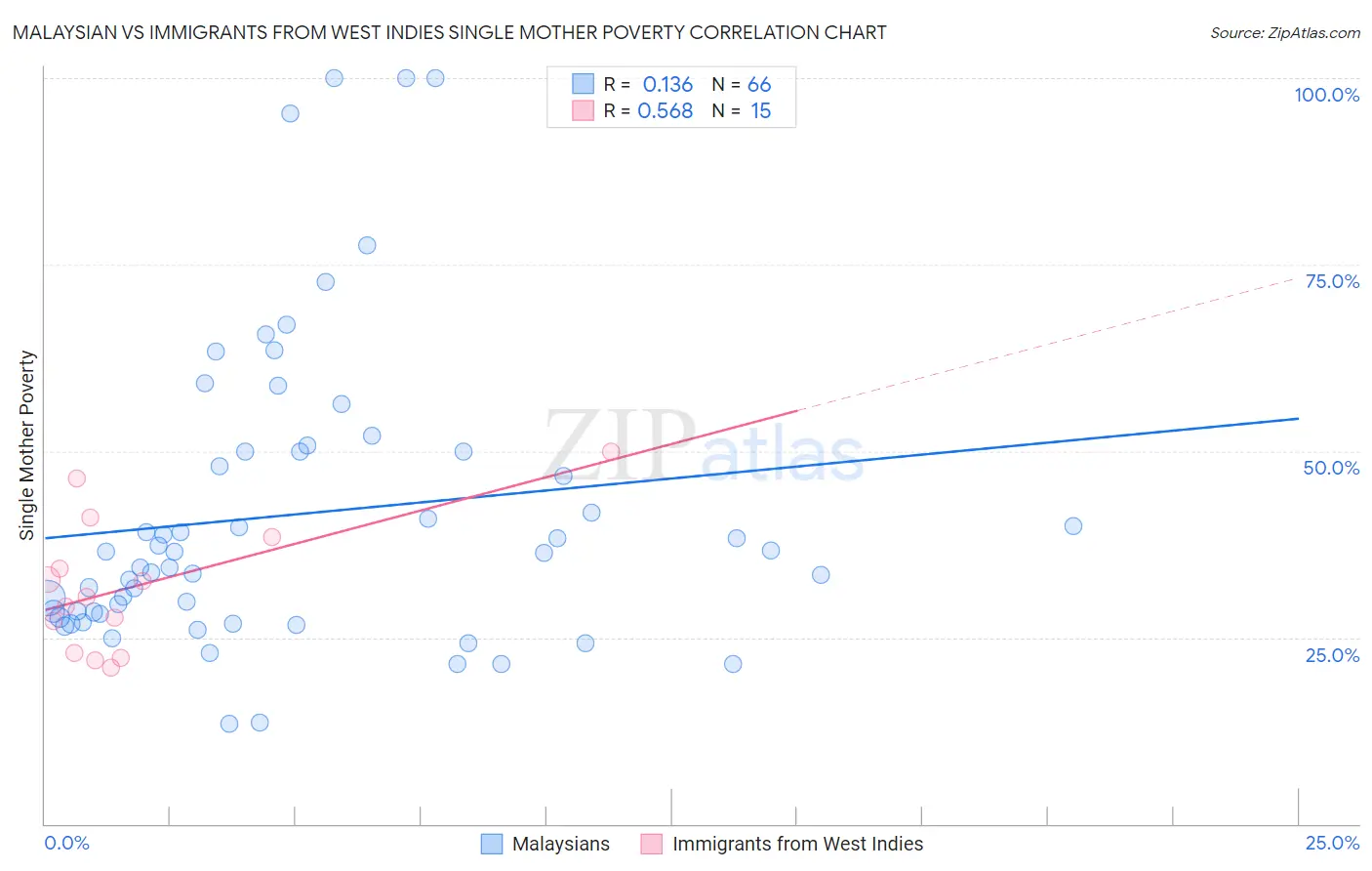 Malaysian vs Immigrants from West Indies Single Mother Poverty Correlation Chart
