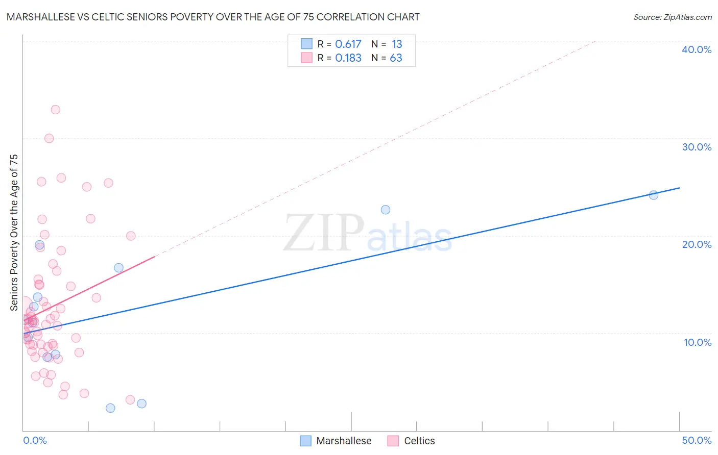 Marshallese vs Celtic Seniors Poverty Over the Age of 75 Correlation Chart