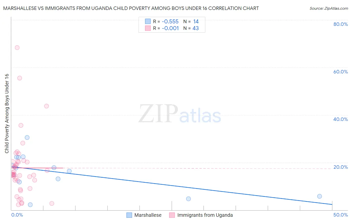 Marshallese vs Immigrants from Uganda Child Poverty Among Boys Under 16 Correlation Chart