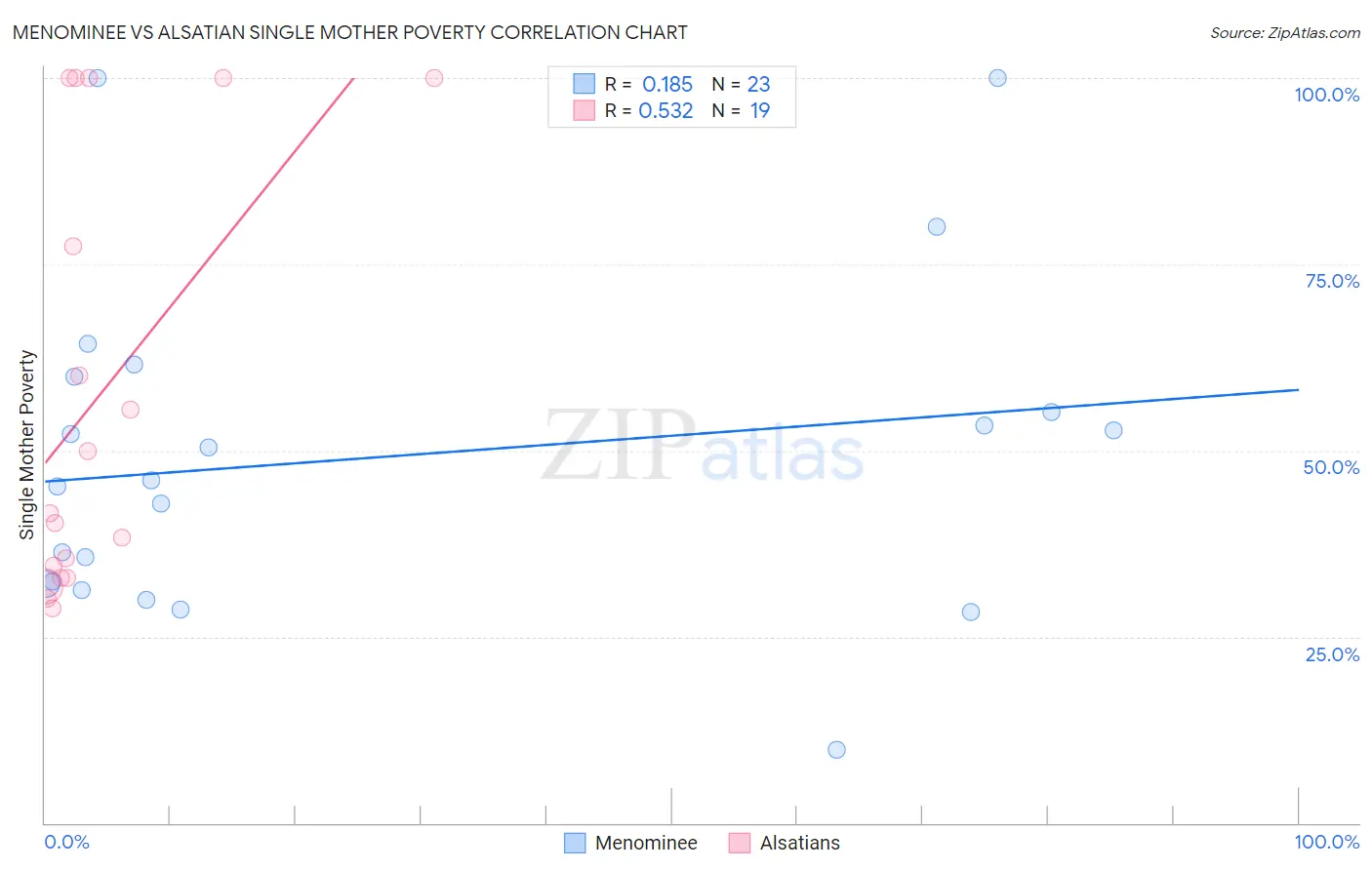 Menominee vs Alsatian Single Mother Poverty Correlation Chart