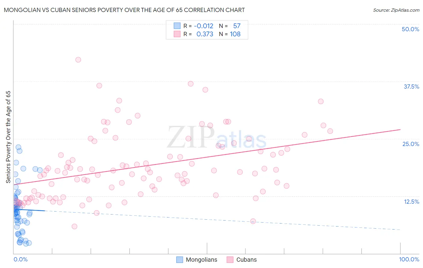 Mongolian vs Cuban Seniors Poverty Over the Age of 65 Correlation Chart