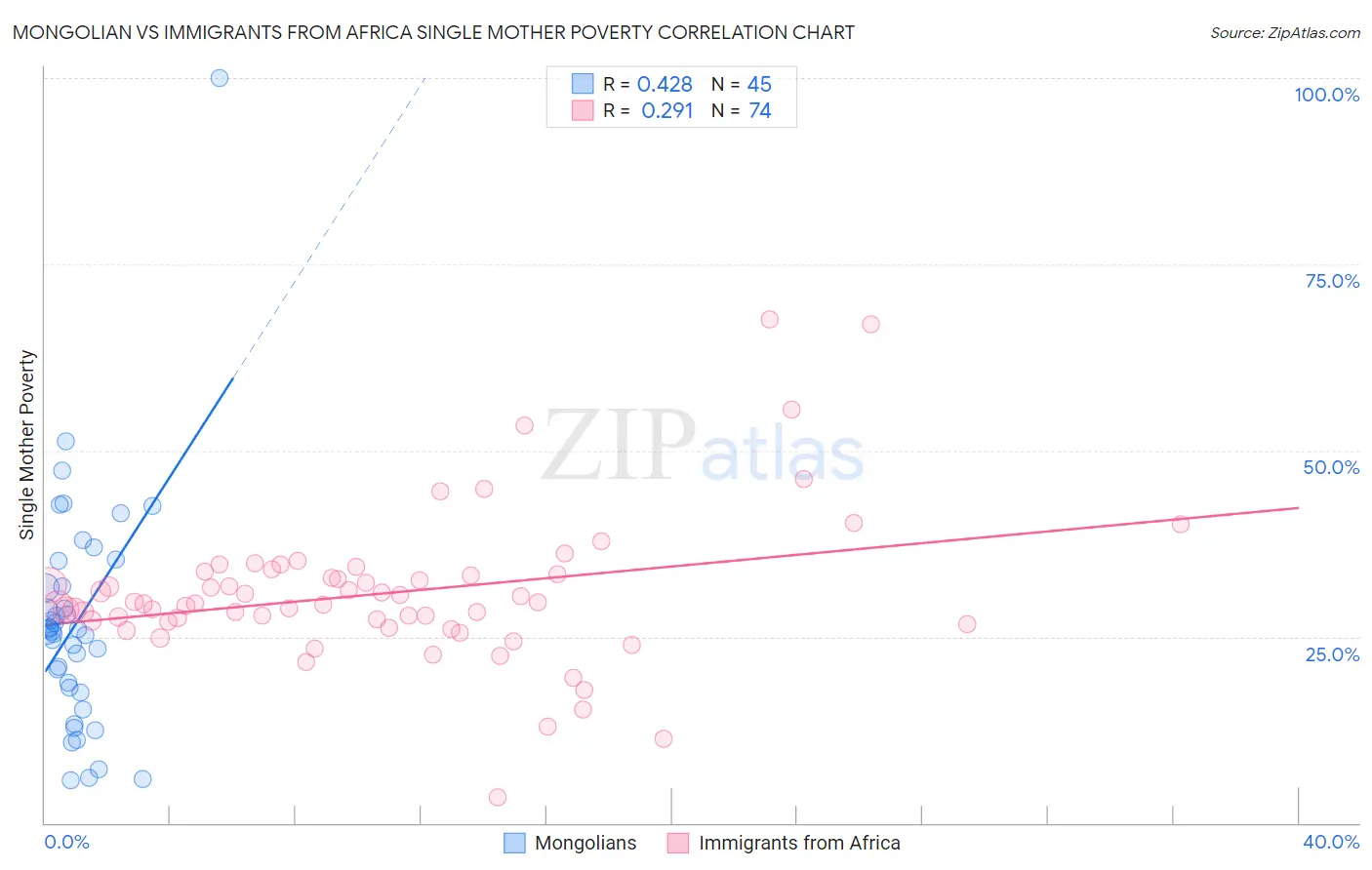 Mongolian vs Immigrants from Africa Single Mother Poverty Correlation Chart