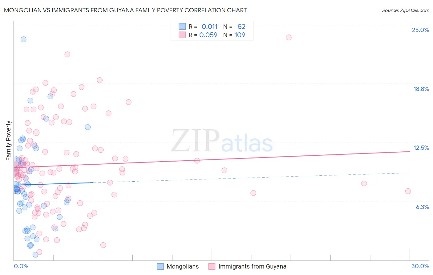 Mongolian vs Immigrants from Guyana Family Poverty Correlation Chart