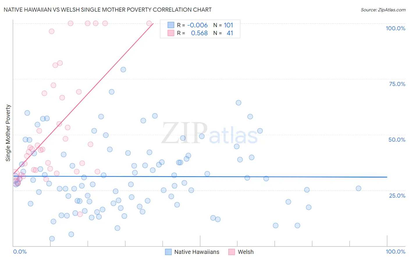Native Hawaiian vs Welsh Single Mother Poverty Correlation Chart