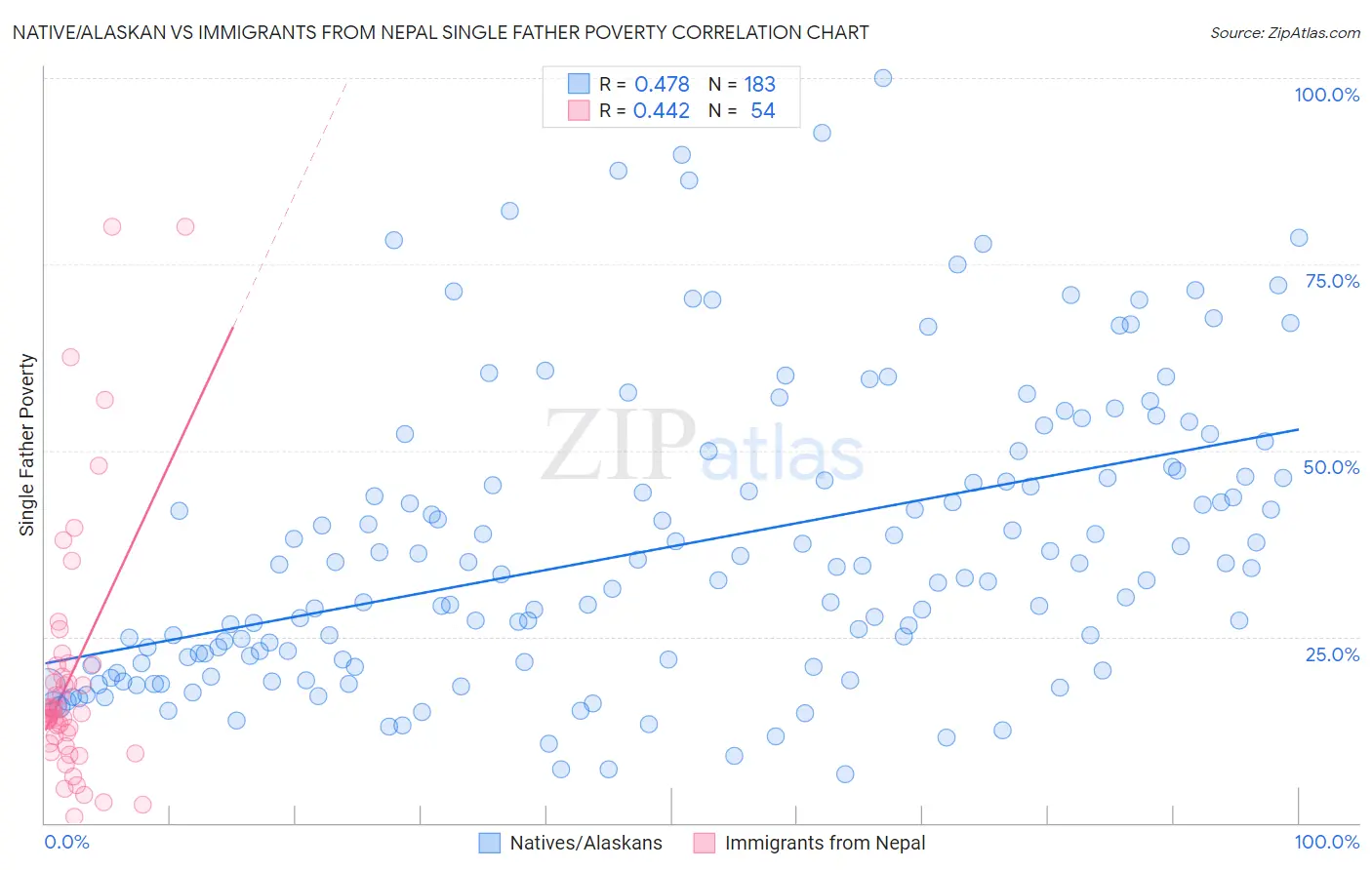 Native/Alaskan vs Immigrants from Nepal Single Father Poverty Correlation Chart