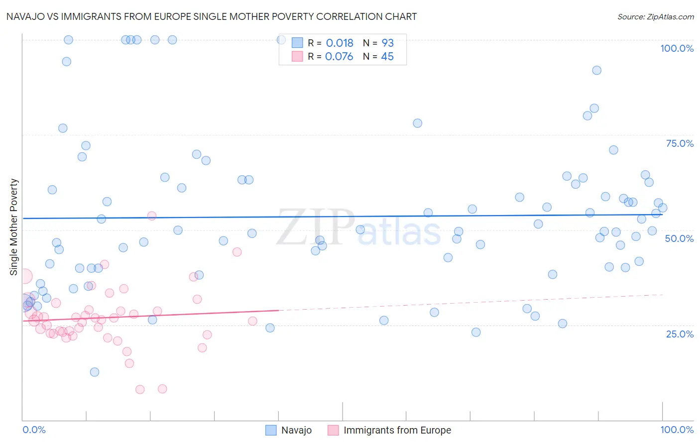 Navajo vs Immigrants from Europe Single Mother Poverty Correlation Chart