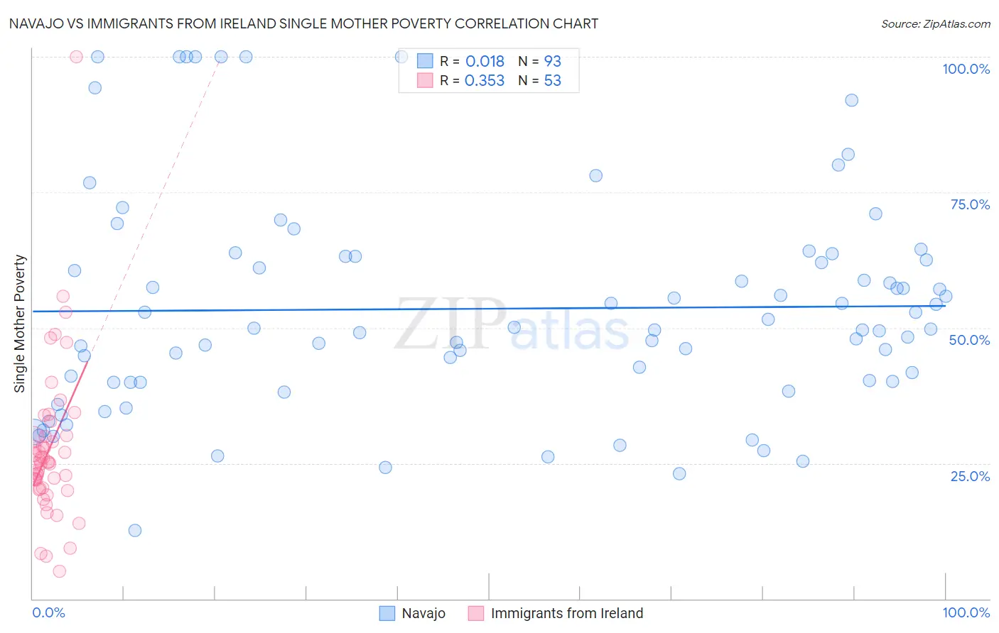 Navajo vs Immigrants from Ireland Single Mother Poverty Correlation Chart