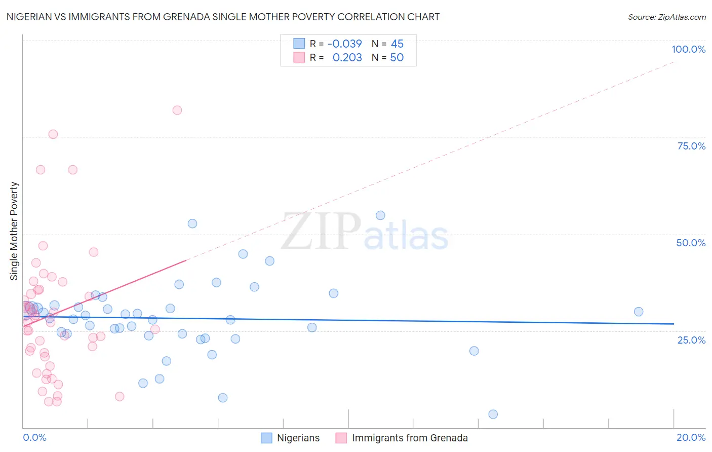 Nigerian vs Immigrants from Grenada Single Mother Poverty Correlation Chart