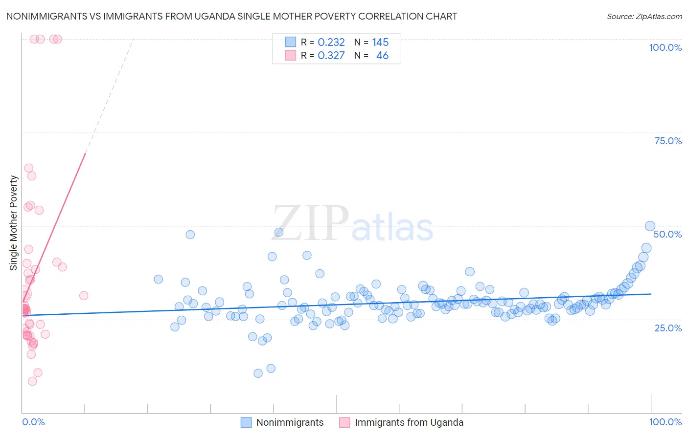 Nonimmigrants vs Immigrants from Uganda Single Mother Poverty Correlation Chart