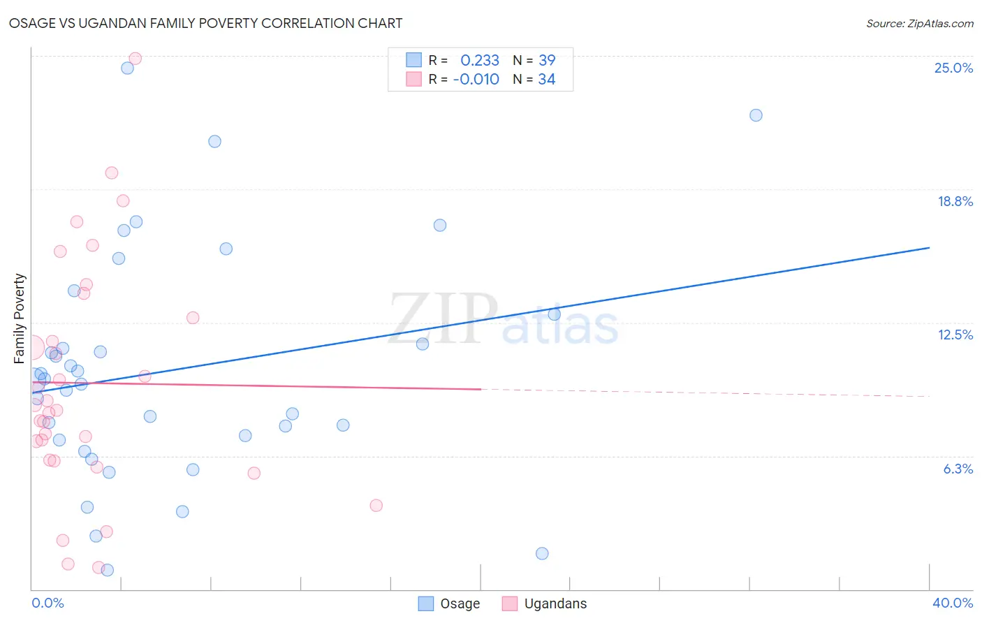 The statistical analysis conducted on geographies consisting of 91,772,722 people shows a weak positive correlation between the proportion of Osage and poverty level among families in the United States with a correlation coefficient (R) of 0.233 and weighted average of 9.7%. Similarly, the statistical analysis conducted on geographies consisting of 93,955,553 people shows no correlation between the proportion of Ugandans and poverty level among families in the United States with a correlation coefficient (R) of -0.010 and weighted average of 9.3%, a difference of 4.9%.