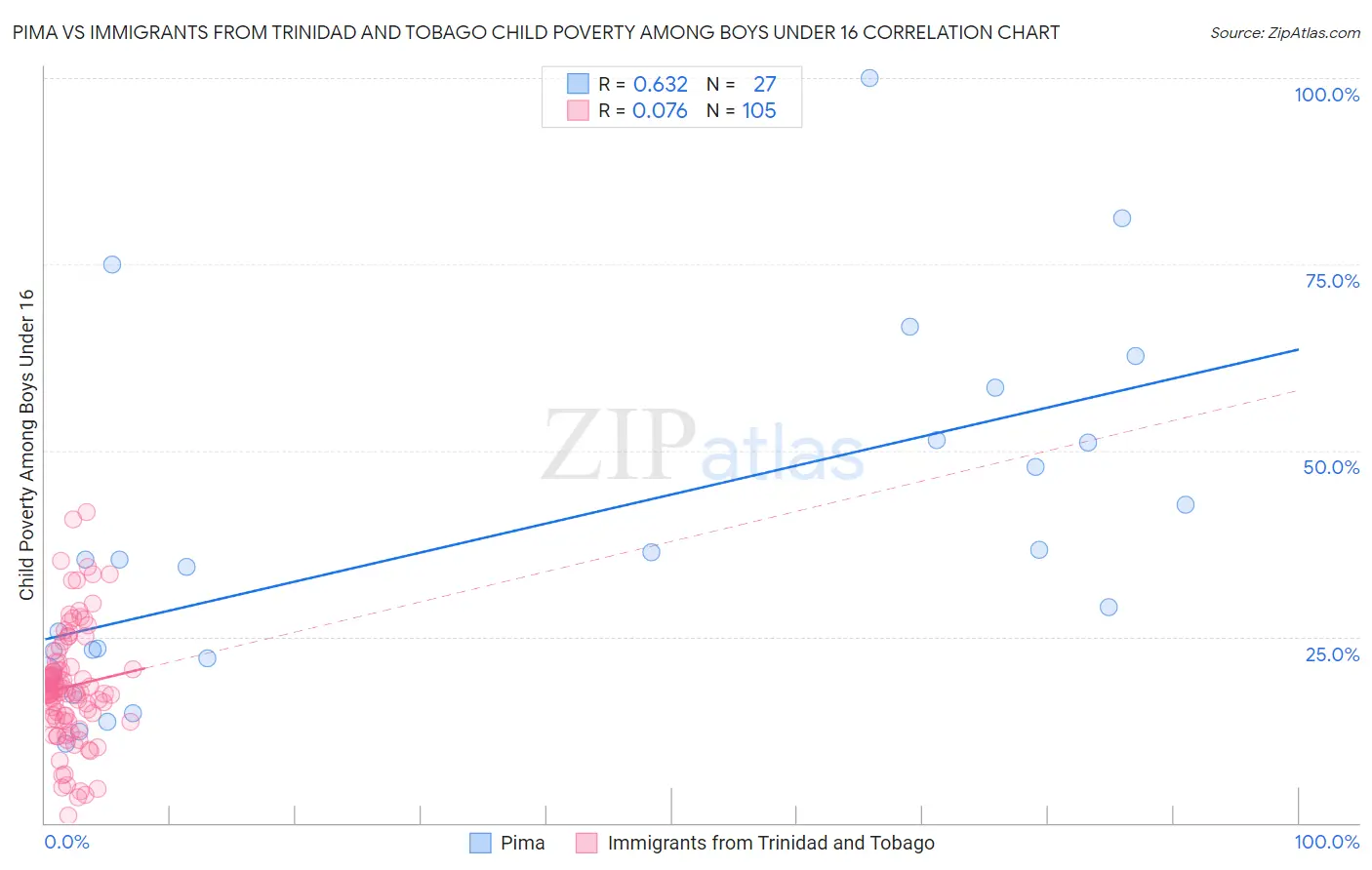 Pima vs Immigrants from Trinidad and Tobago Child Poverty Among Boys Under 16 Correlation Chart
