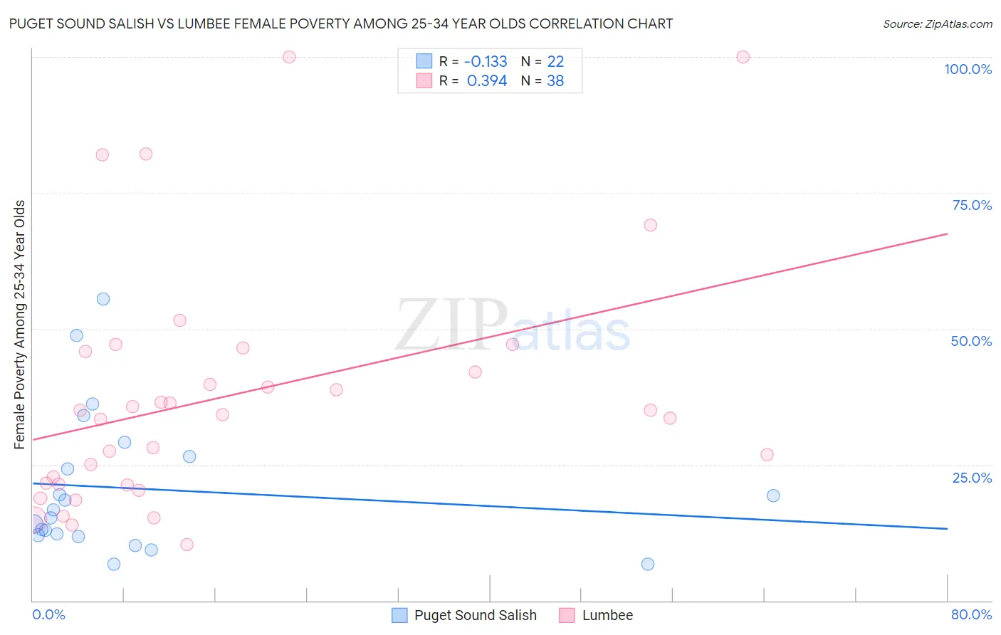 Puget Sound Salish vs Lumbee Female Poverty Among 25-34 Year Olds Correlation Chart