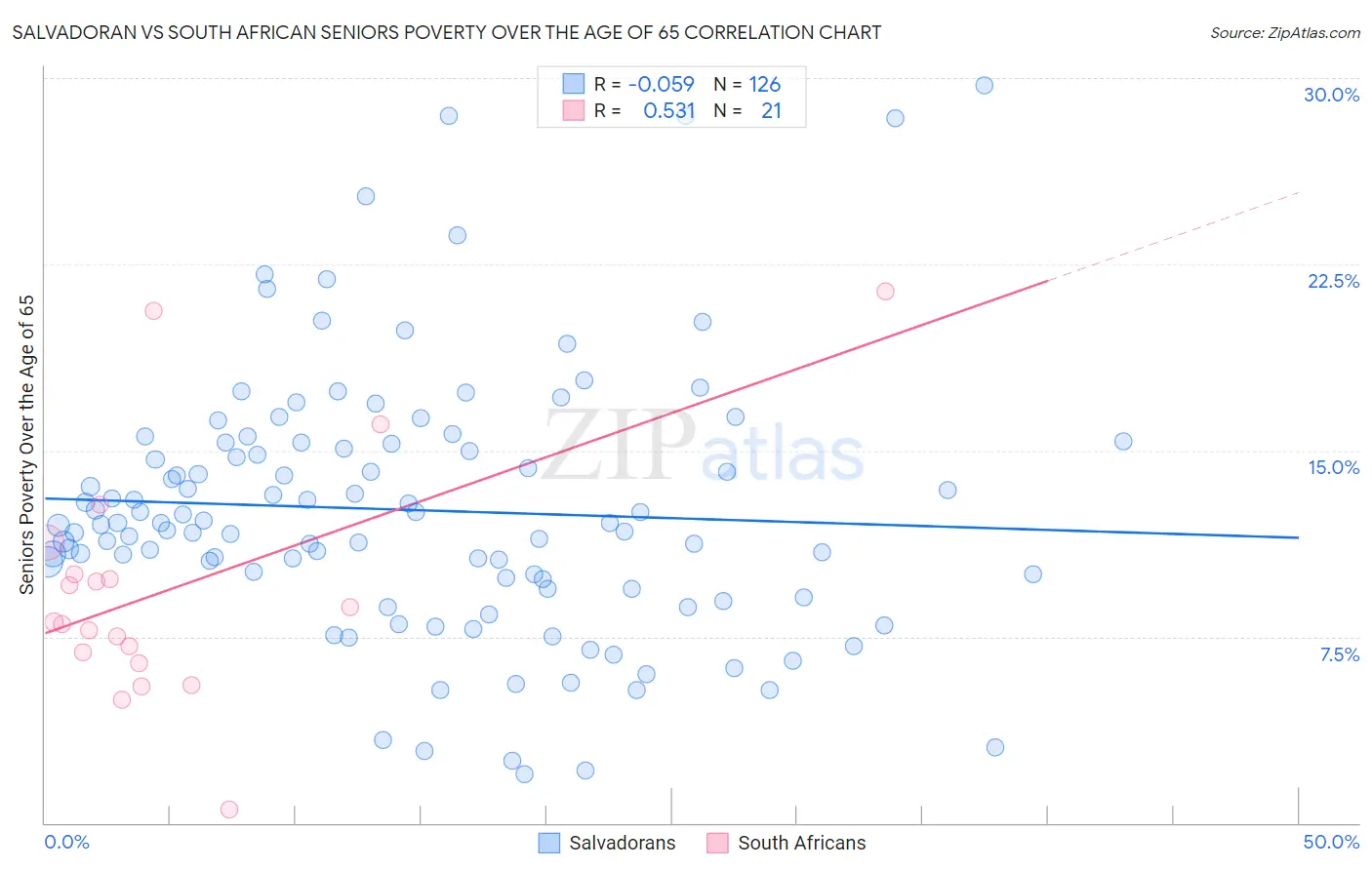 The statistical analysis conducted on geographies consisting of 397,362,950 people shows a slight negative correlation between the proportion of Salvadorans and poverty level among seniors over the age of 65 in the United States with a correlation coefficient (R) of -0.059 and weighted average of 12.8%. Similarly, the statistical analysis conducted on geographies consisting of 182,245,174 people shows a substantial positive correlation between the proportion of South Africans and poverty level among seniors over the age of 65 in the United States with a correlation coefficient (R) of 0.531 and weighted average of 10.3%, a difference of 25.0%.