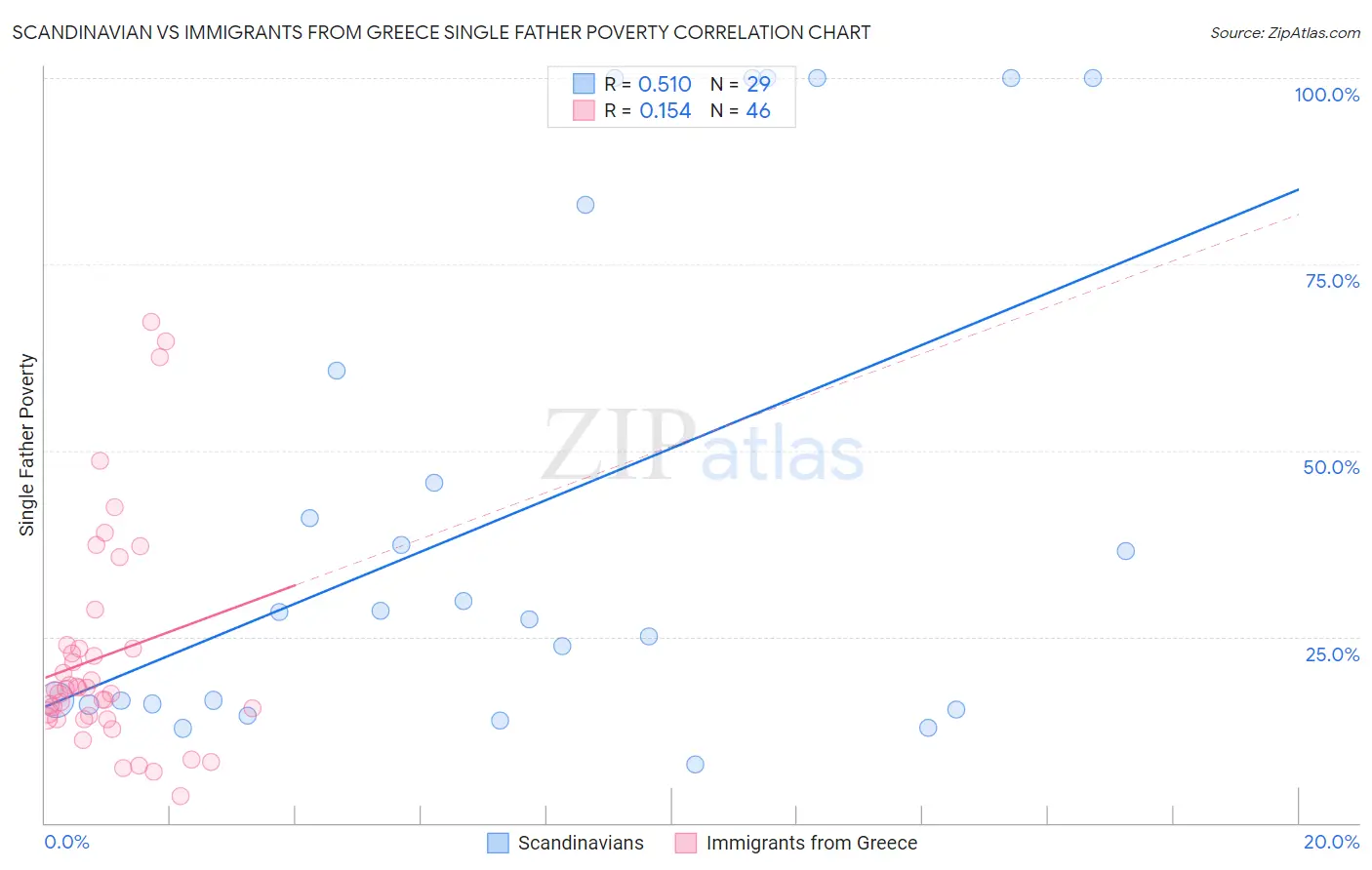 Scandinavian vs Immigrants from Greece Single Father Poverty Correlation Chart