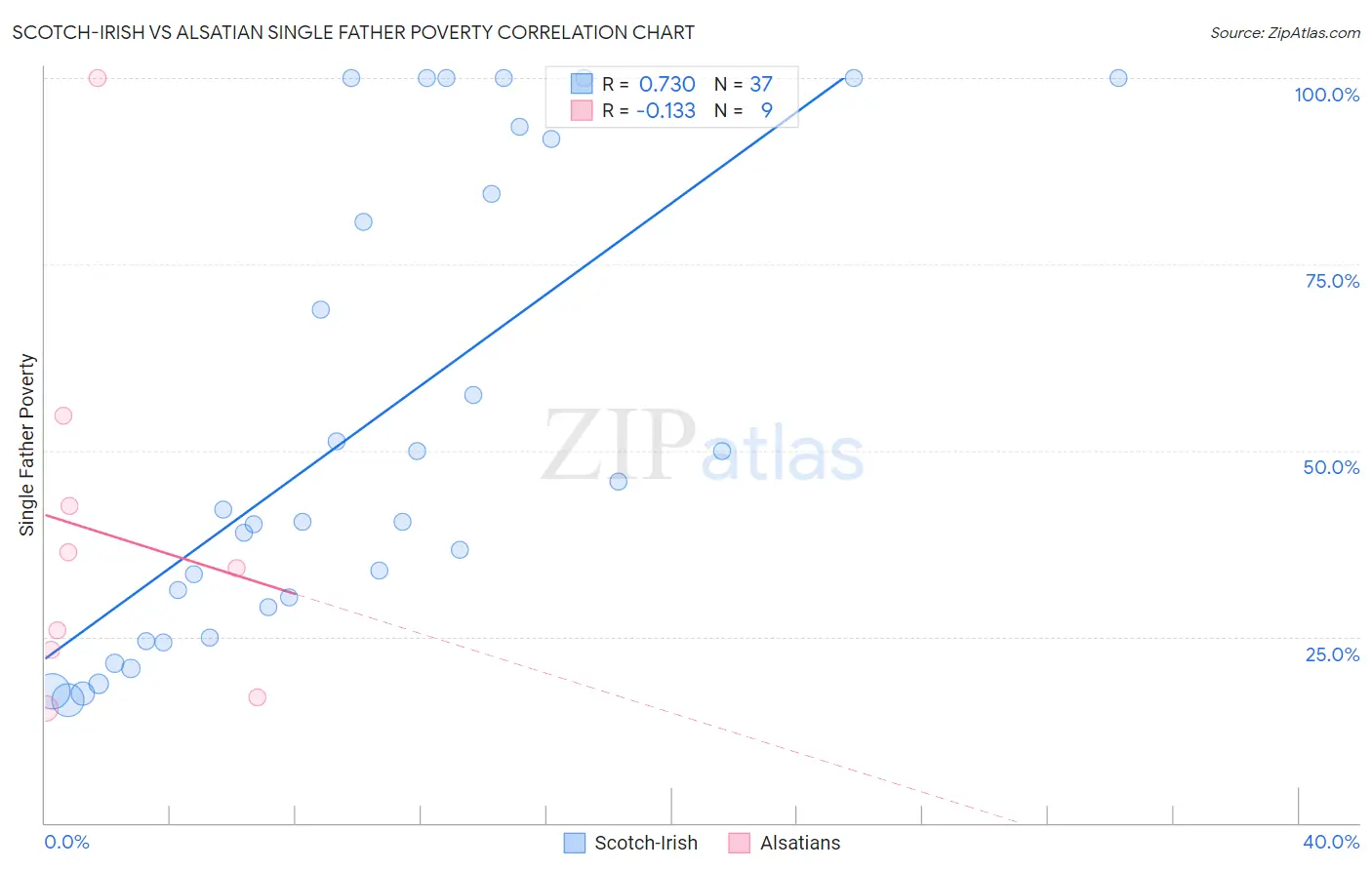 Scotch-Irish vs Alsatian Single Father Poverty Correlation Chart