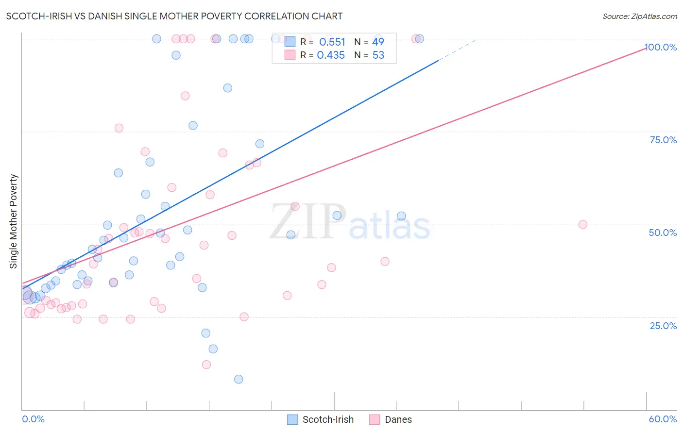Scotch-Irish vs Danish Single Mother Poverty Correlation Chart