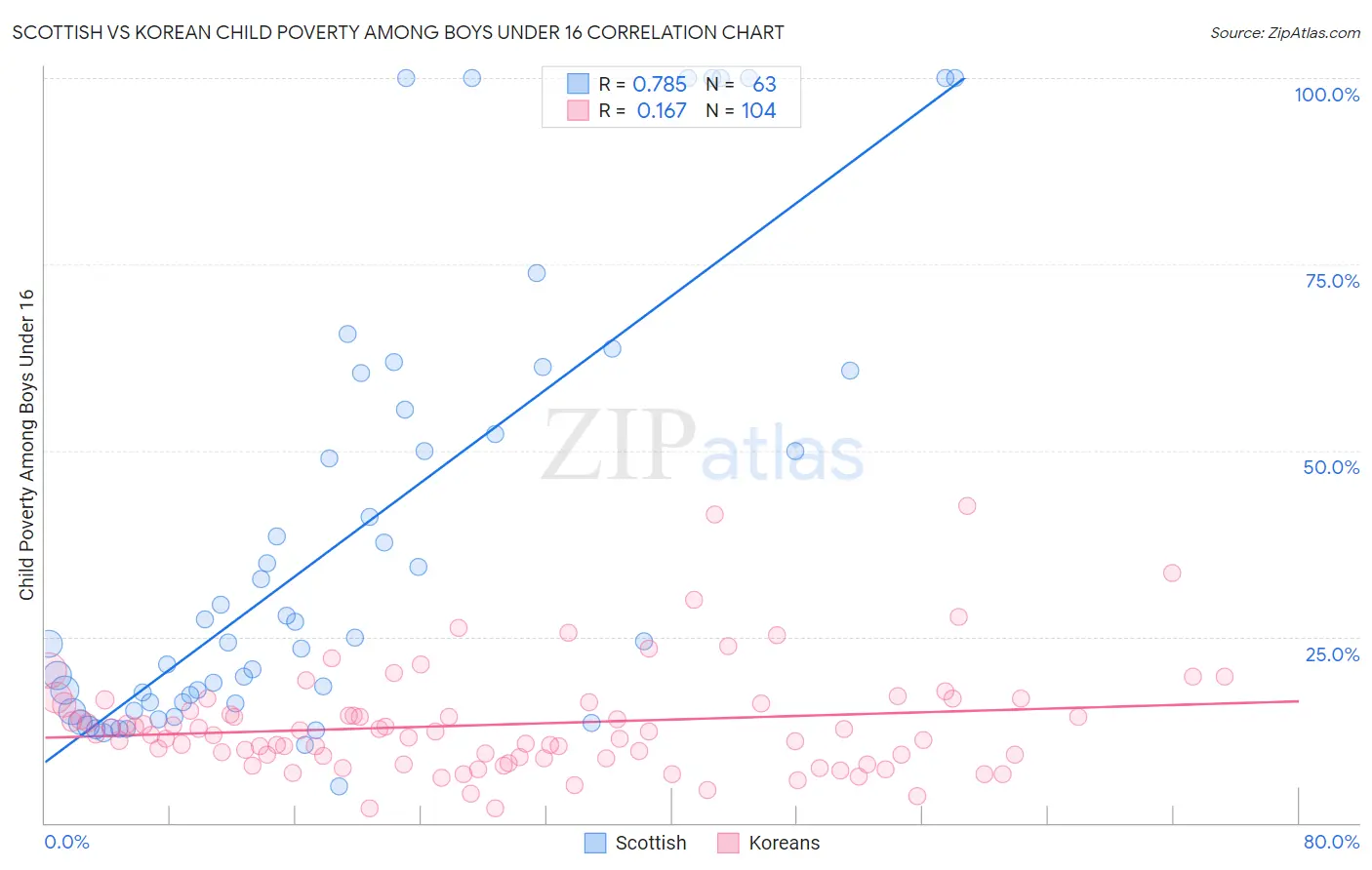 The statistical analysis conducted on geographies consisting of 546,371,305 people shows a strong positive correlation between the proportion of Scottish and poverty level among boys under the age of 16 in the United States with a correlation coefficient (R) of 0.785 and weighted average of 15.2%. Similarly, the statistical analysis conducted on geographies consisting of 498,598,673 people shows a poor positive correlation between the proportion of Koreans and poverty level among boys under the age of 16 in the United States with a correlation coefficient (R) of 0.167 and weighted average of 14.0%, a difference of 9.3%.