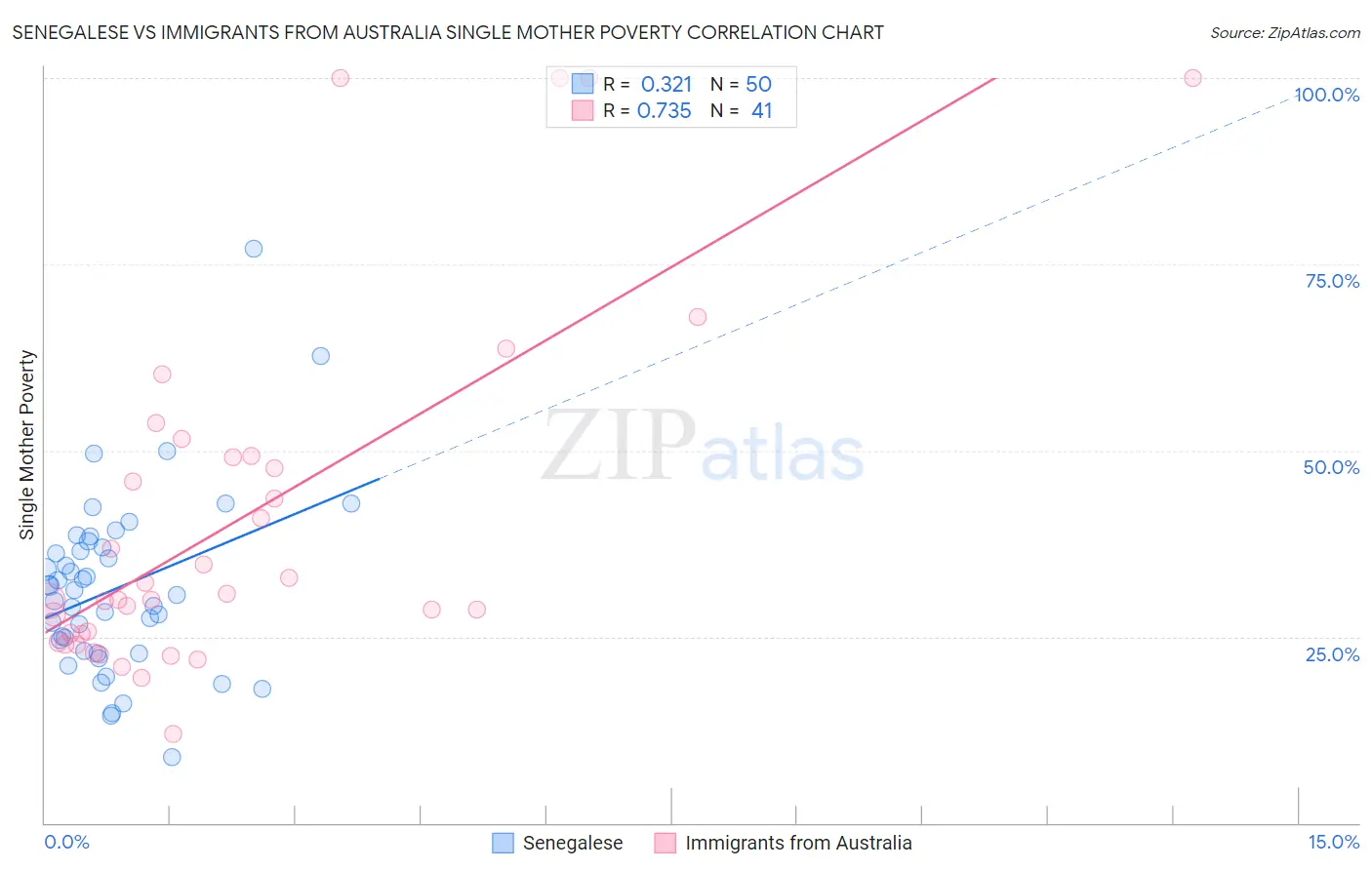 Senegalese vs Immigrants from Australia Single Mother Poverty Correlation Chart
