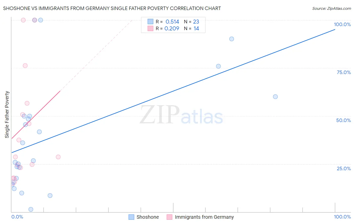 Shoshone vs Immigrants from Germany Single Father Poverty Correlation Chart