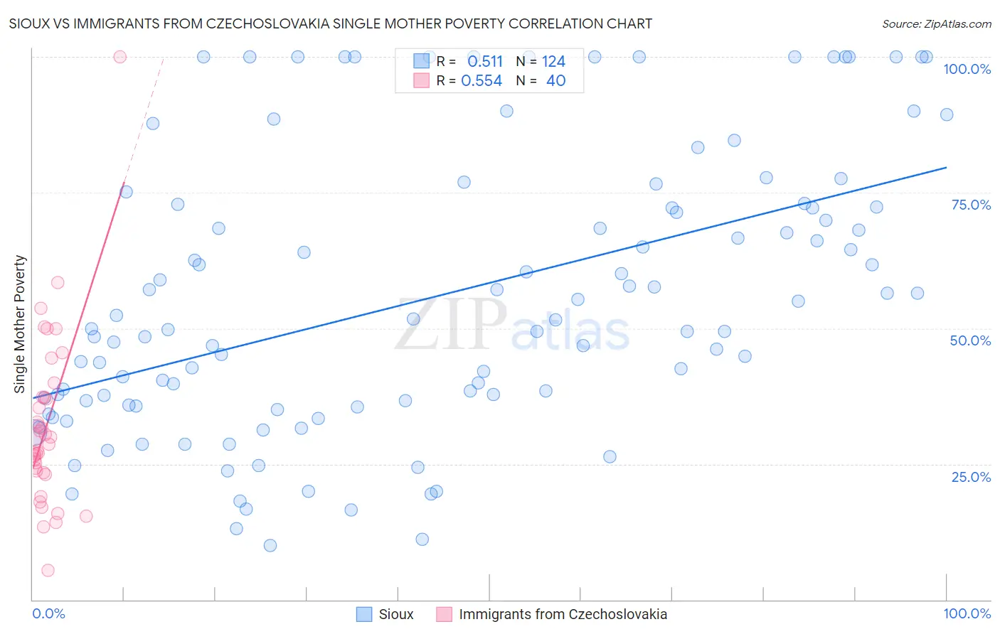 Sioux vs Immigrants from Czechoslovakia Single Mother Poverty Correlation Chart
