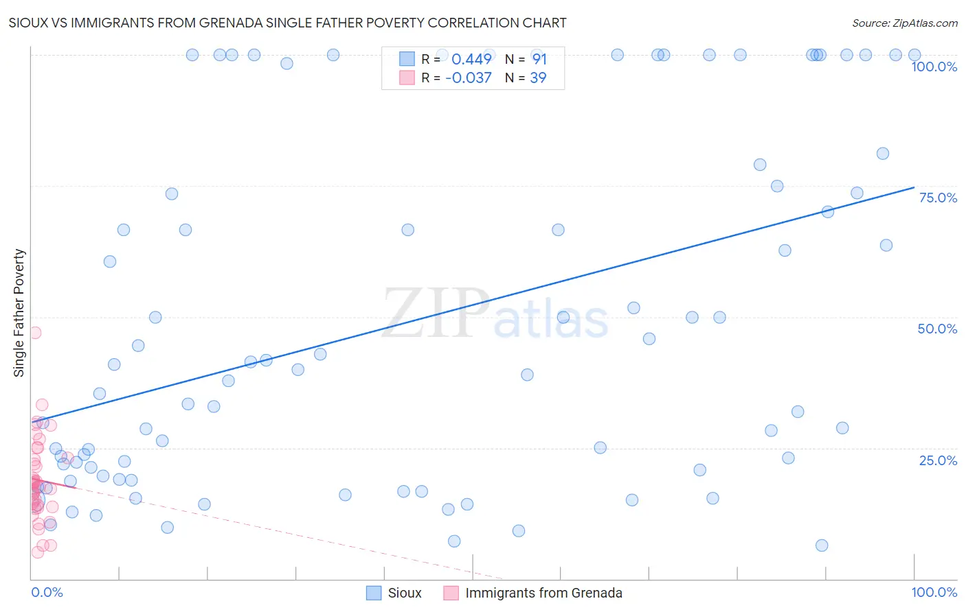 Sioux vs Immigrants from Grenada Single Father Poverty Correlation Chart