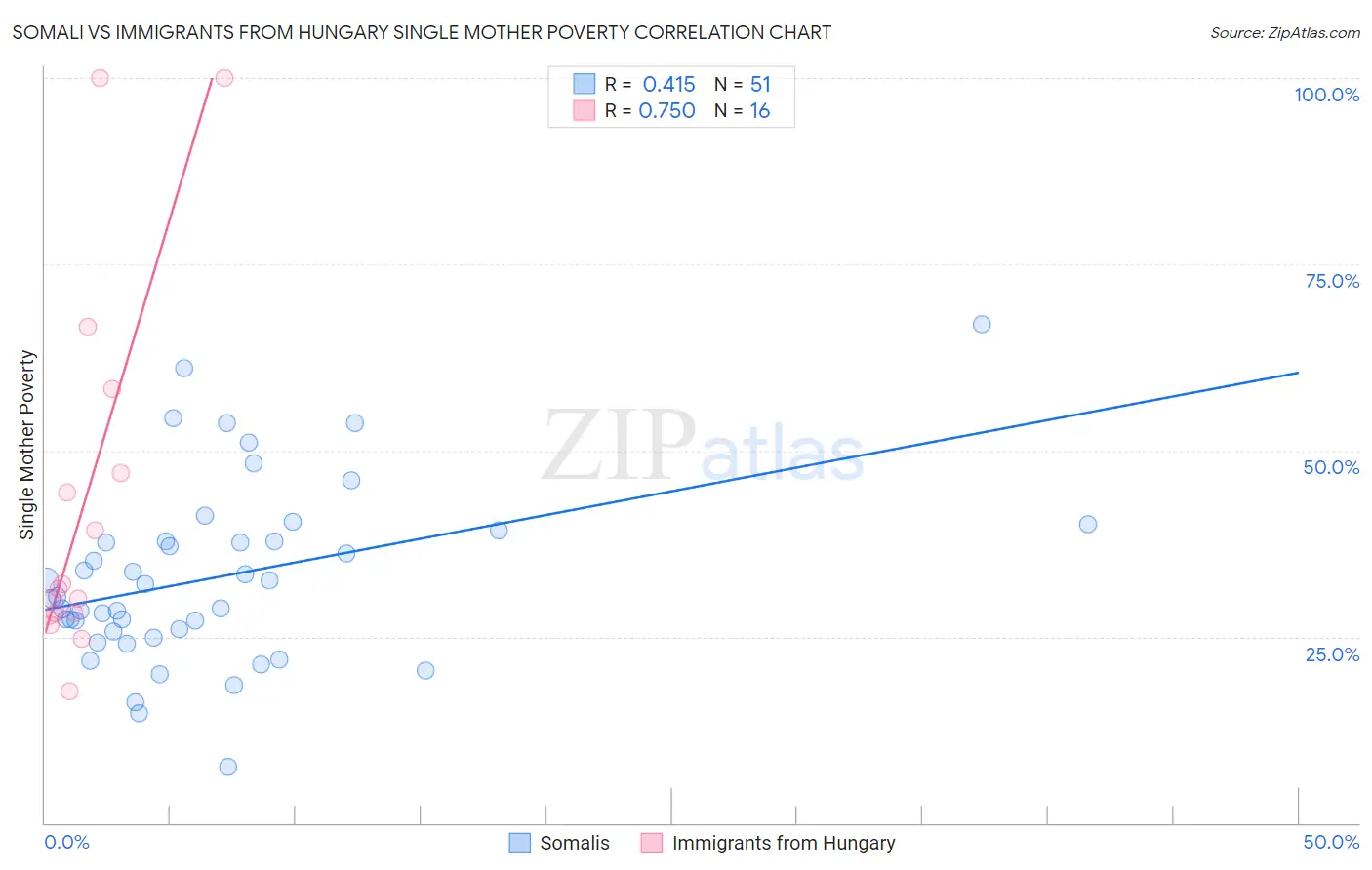 Somali vs Immigrants from Hungary Single Mother Poverty Correlation Chart