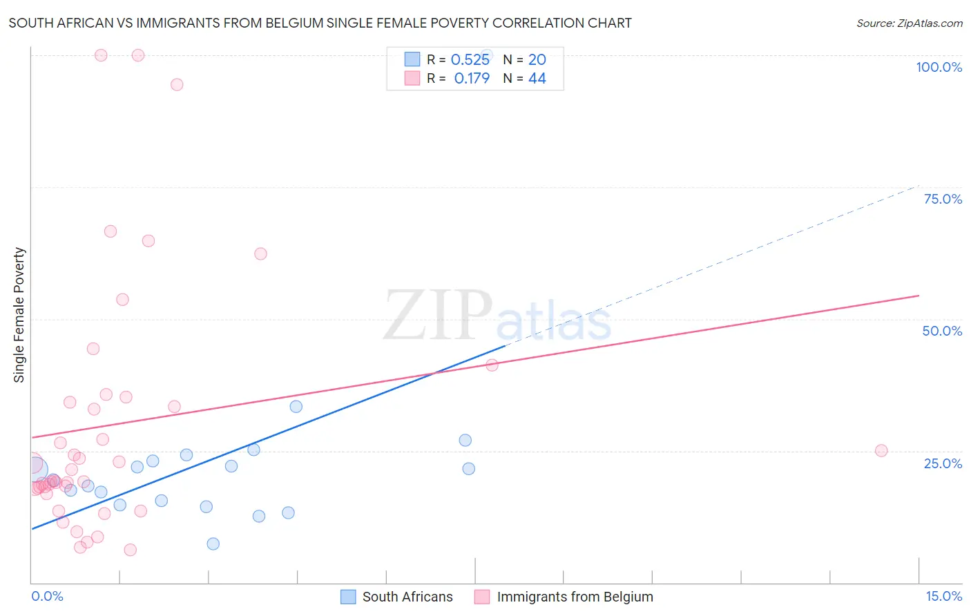 South African vs Immigrants from Belgium Single Female Poverty Correlation Chart