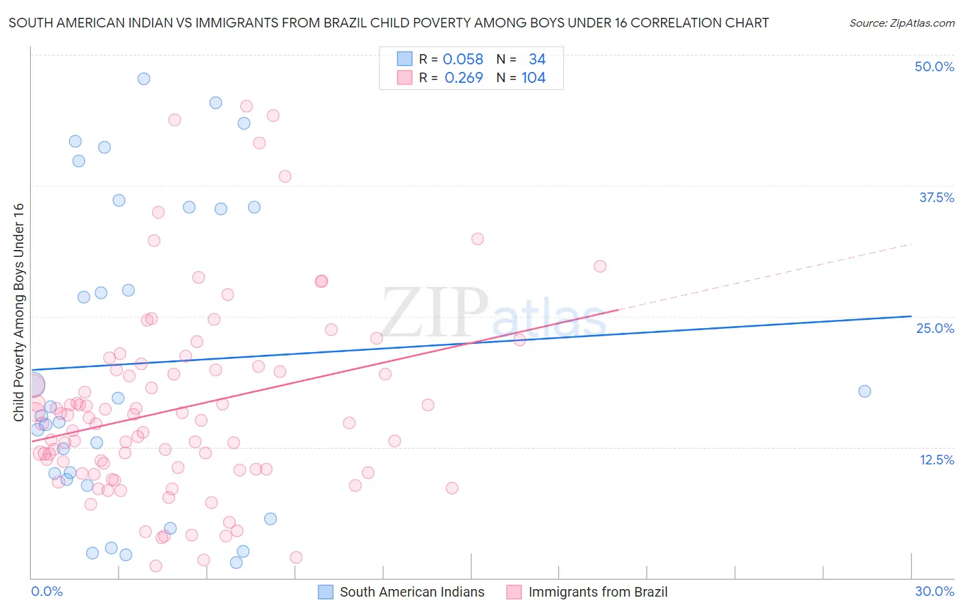 South American Indian vs Immigrants from Brazil Child Poverty Among Boys Under 16 Correlation Chart