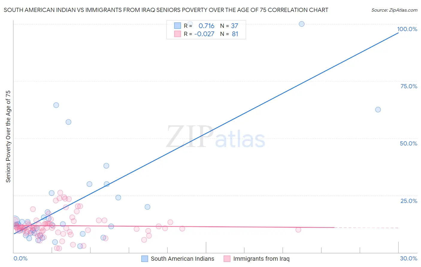 South American Indian vs Immigrants from Iraq Seniors Poverty Over the Age of 75 Correlation Chart