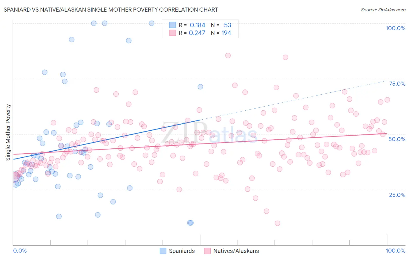 Spaniard vs Native/Alaskan Single Mother Poverty Correlation Chart