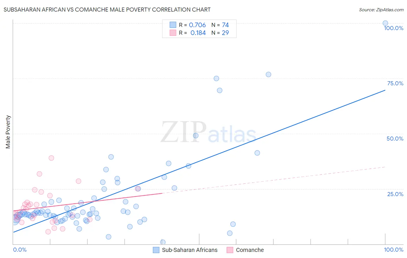 Subsaharan African vs Comanche Male Poverty Correlation Chart
