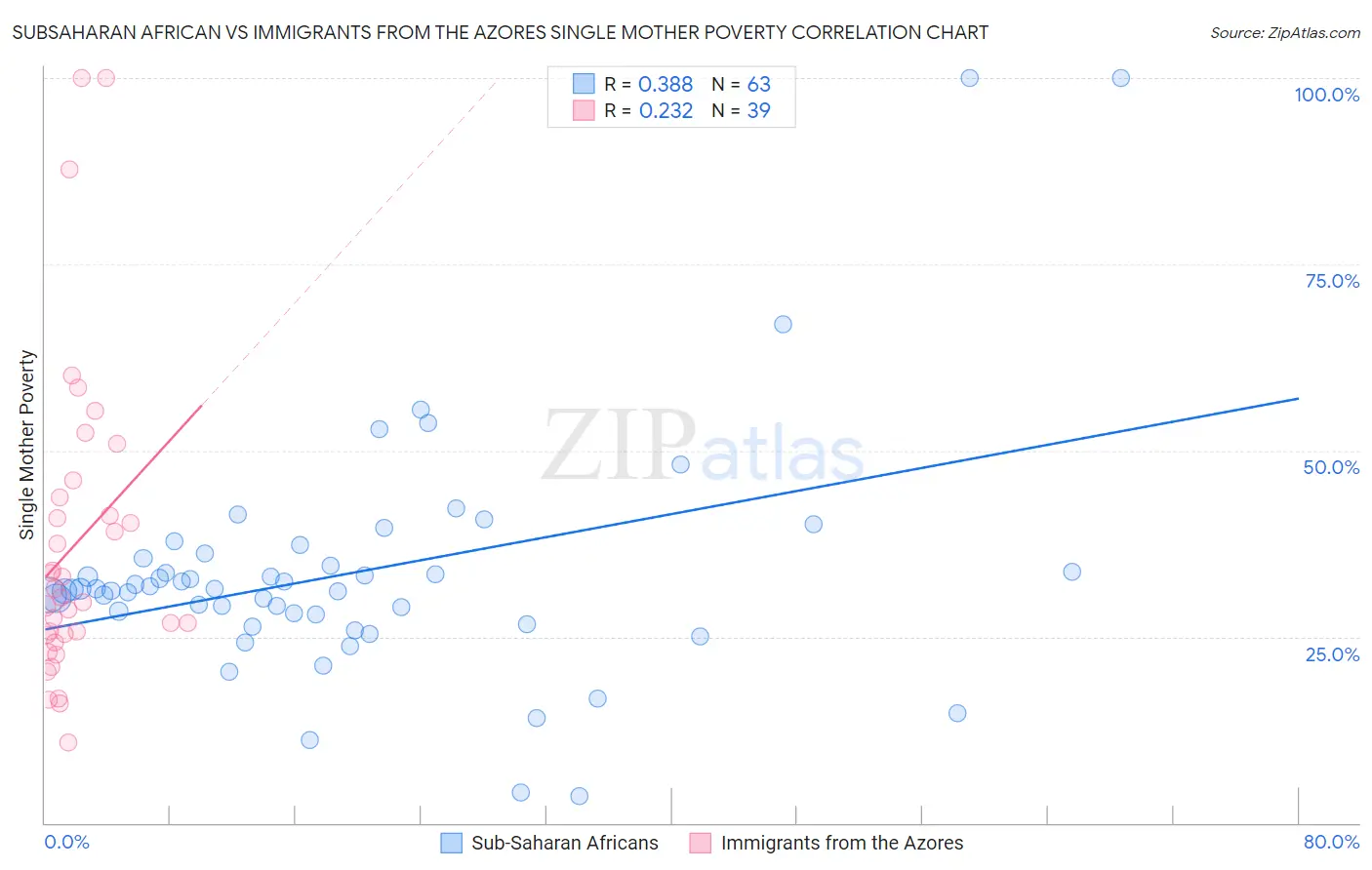 Subsaharan African vs Immigrants from the Azores Single Mother Poverty Correlation Chart