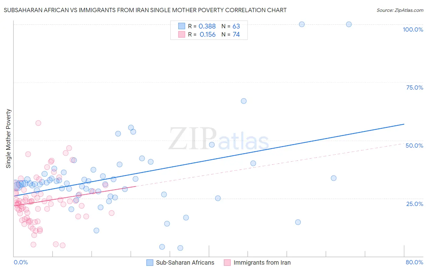 Subsaharan African vs Immigrants from Iran Single Mother Poverty Correlation Chart