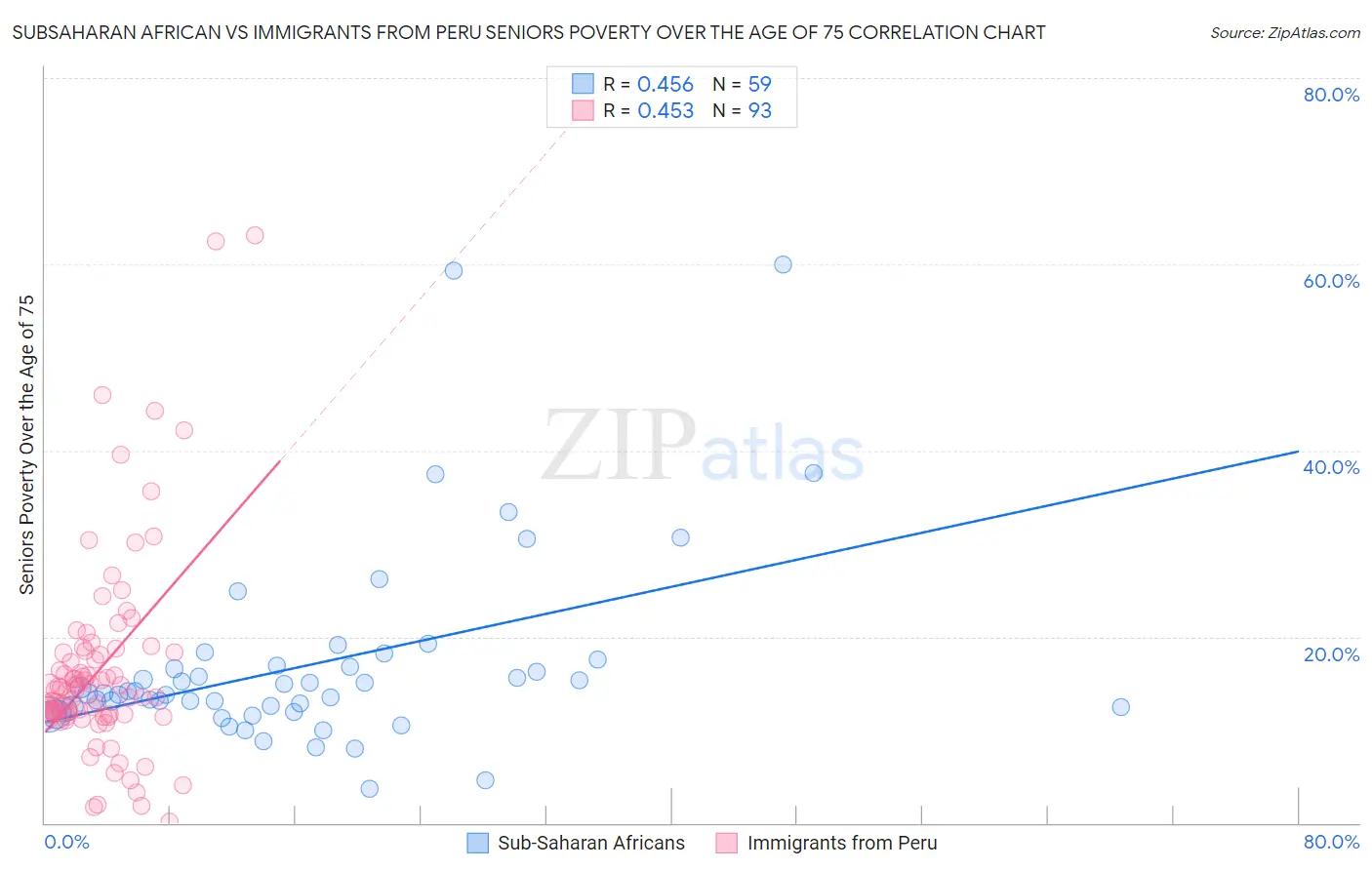 Subsaharan African vs Immigrants from Peru Seniors Poverty Over the Age of 75 Correlation Chart