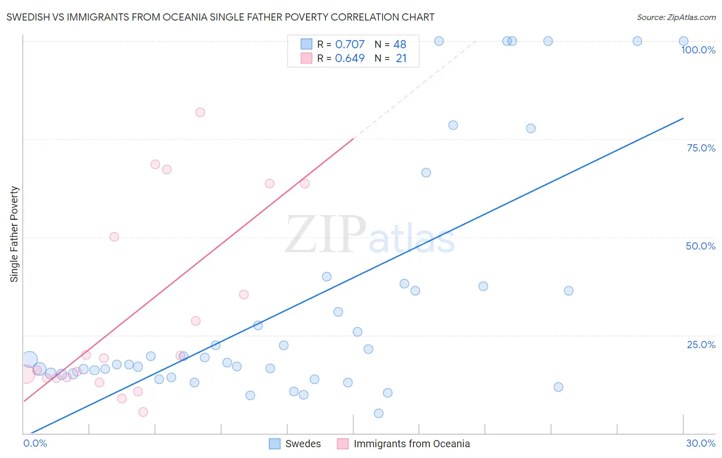 Swedish vs Immigrants from Oceania Single Father Poverty Correlation Chart