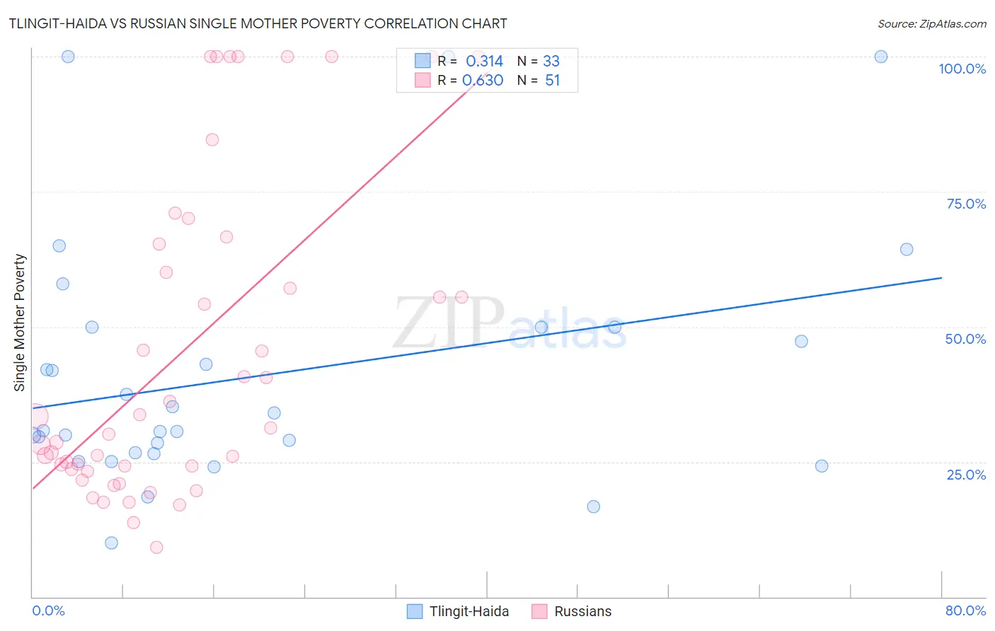 Tlingit-Haida vs Russian Single Mother Poverty Correlation Chart