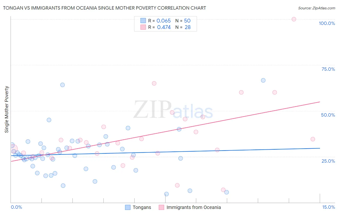 Tongan vs Immigrants from Oceania Single Mother Poverty Correlation Chart