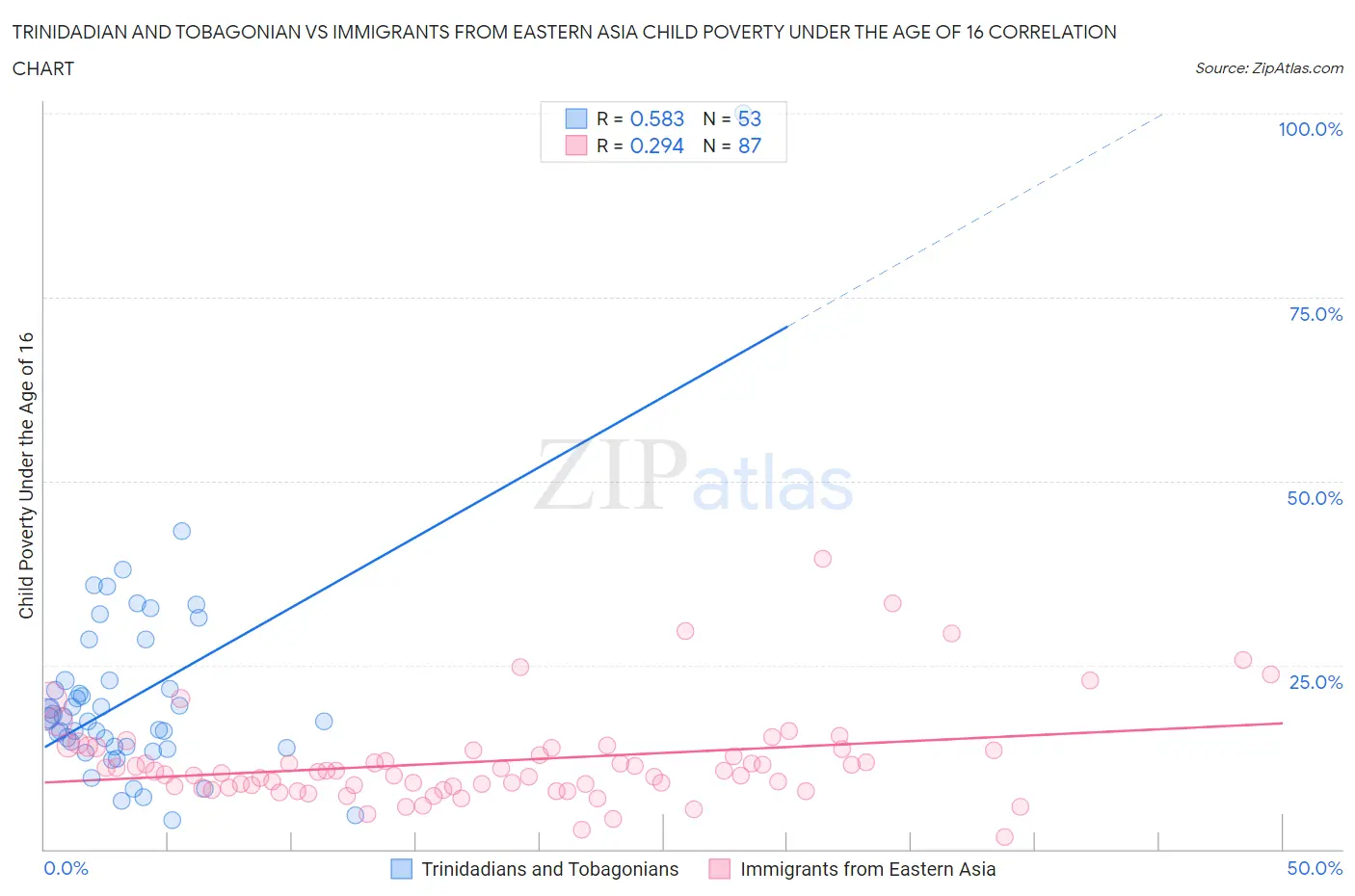 Trinidadian and Tobagonian vs Immigrants from Eastern Asia Child Poverty Under the Age of 16 Correlation Chart