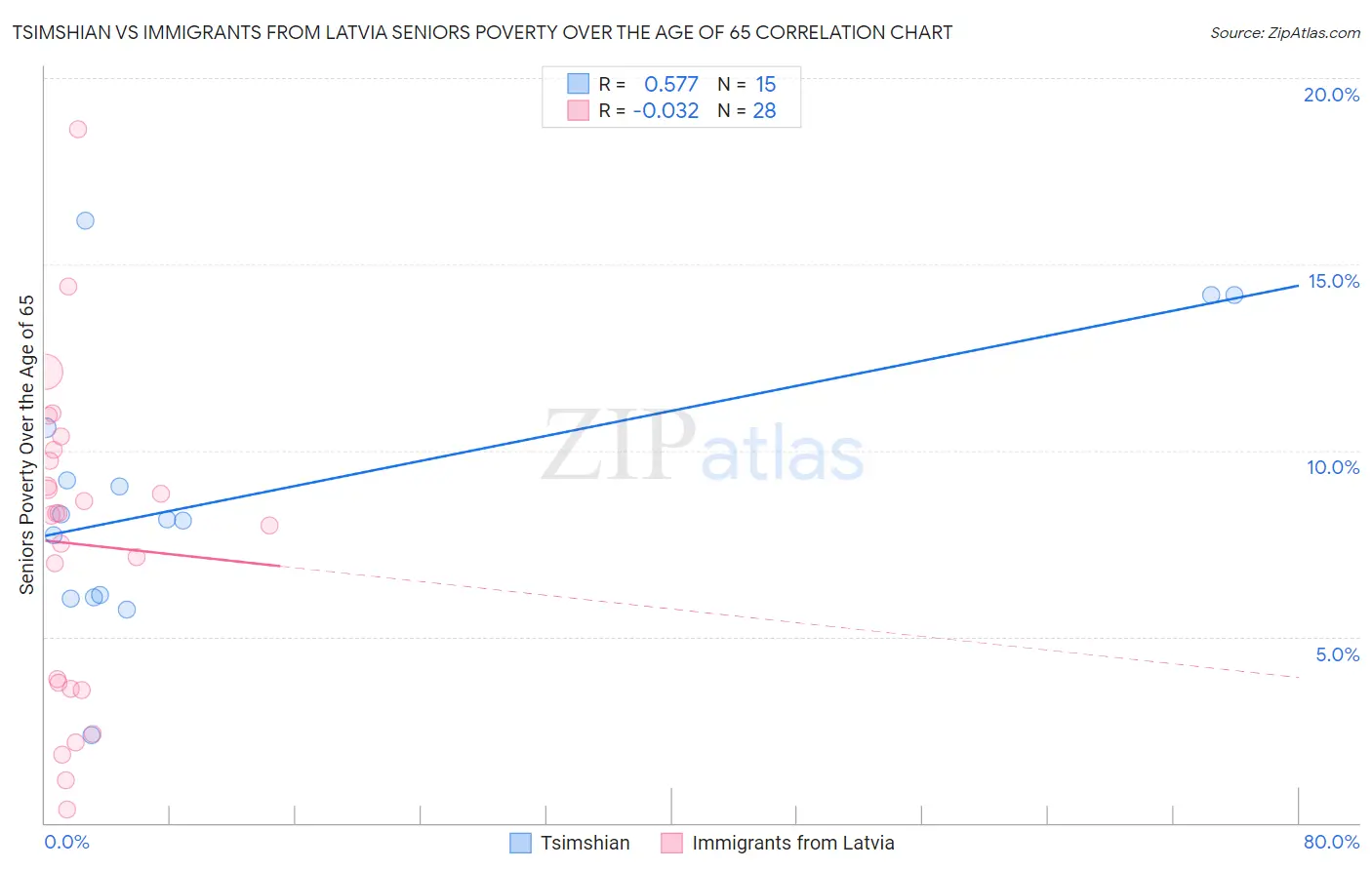 Tsimshian vs Immigrants from Latvia Seniors Poverty Over the Age of 65 Correlation Chart