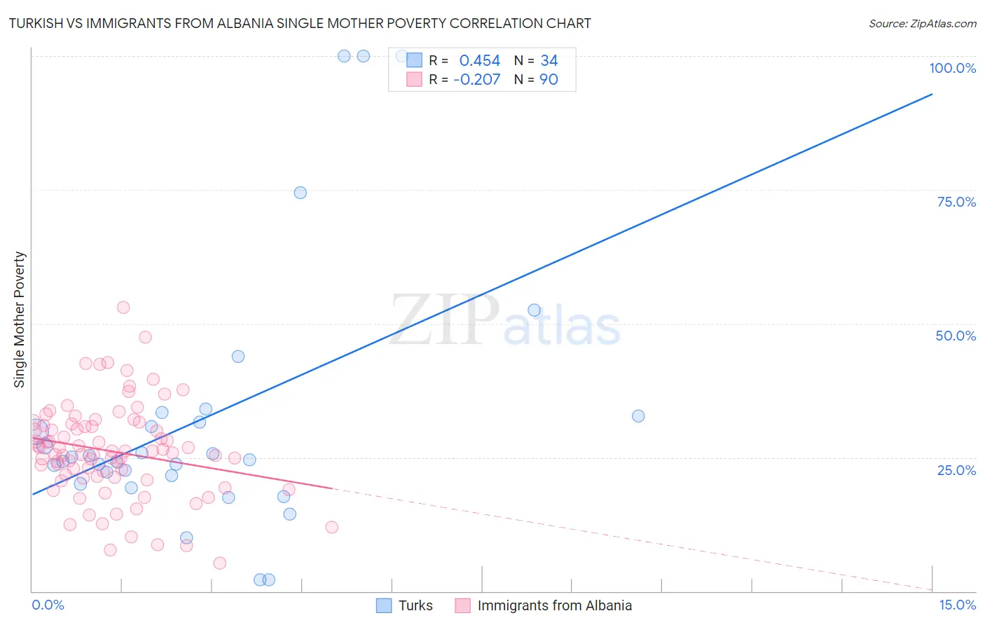 Turkish vs Immigrants from Albania Single Mother Poverty Correlation Chart