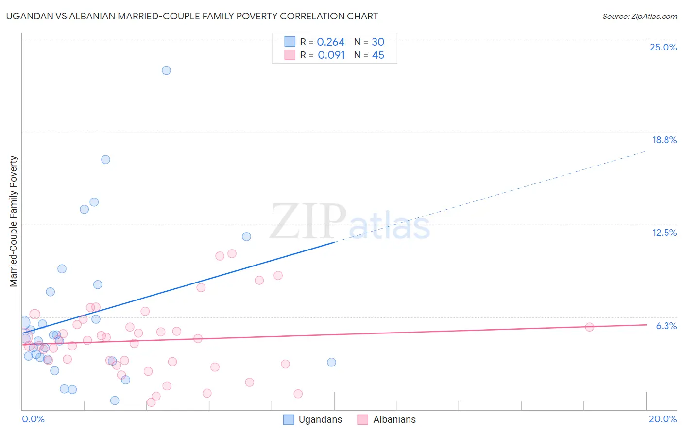The statistical analysis conducted on geographies consisting of 93,779,769 people shows a weak positive correlation between the proportion of Ugandans and poverty level among married-couple families in the United States with a correlation coefficient (R) of 0.264 and weighted average of 5.3%. Similarly, the statistical analysis conducted on geographies consisting of 191,950,147 people shows a slight positive correlation between the proportion of Albanians and poverty level among married-couple families in the United States with a correlation coefficient (R) of 0.091 and weighted average of 5.0%, a difference of 6.0%.