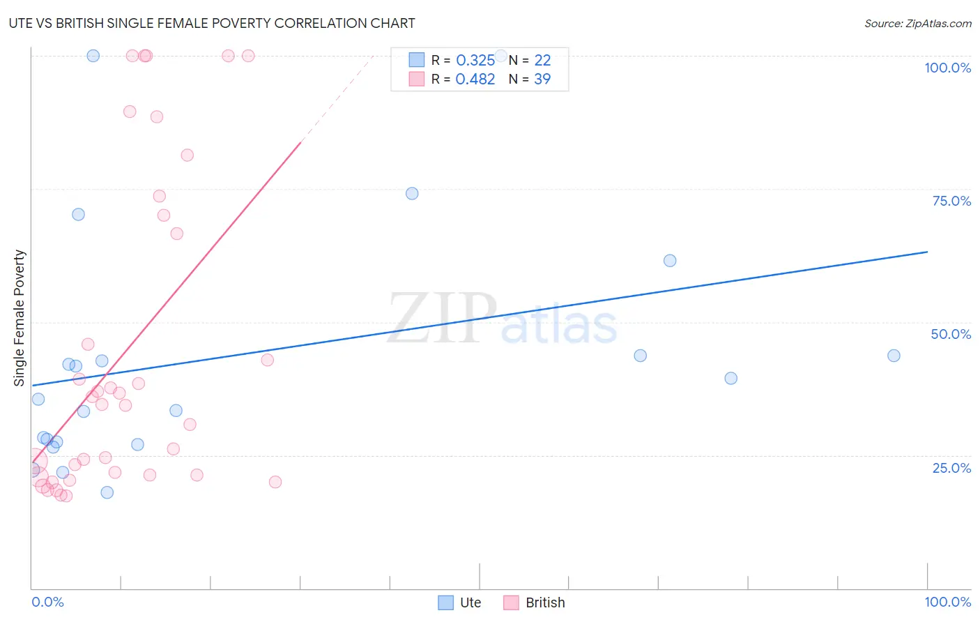 Ute vs British Single Female Poverty Correlation Chart