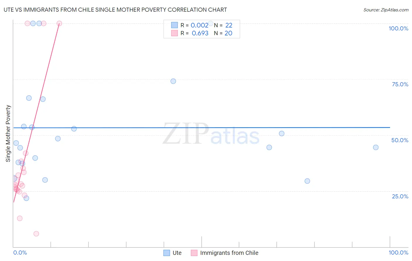 Ute vs Immigrants from Chile Single Mother Poverty Correlation Chart