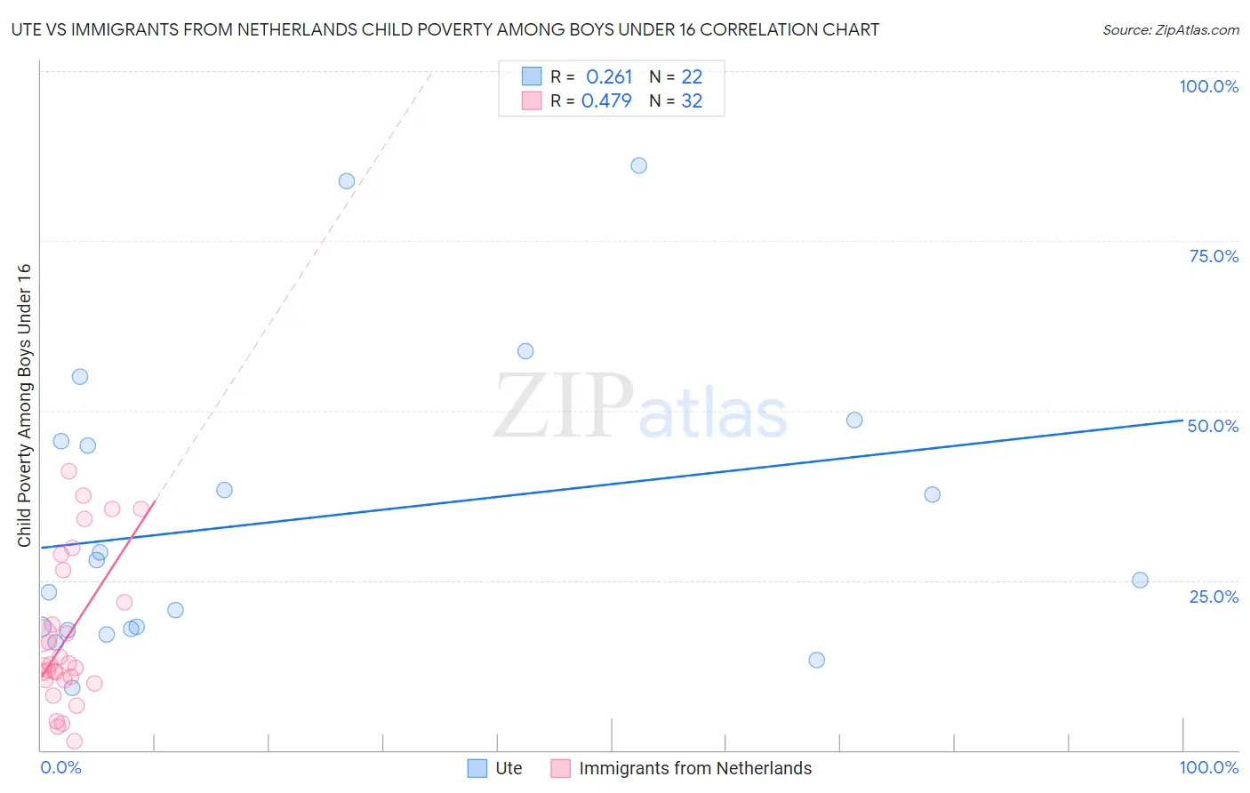 Ute vs Immigrants from Netherlands Child Poverty Among Boys Under 16 Correlation Chart