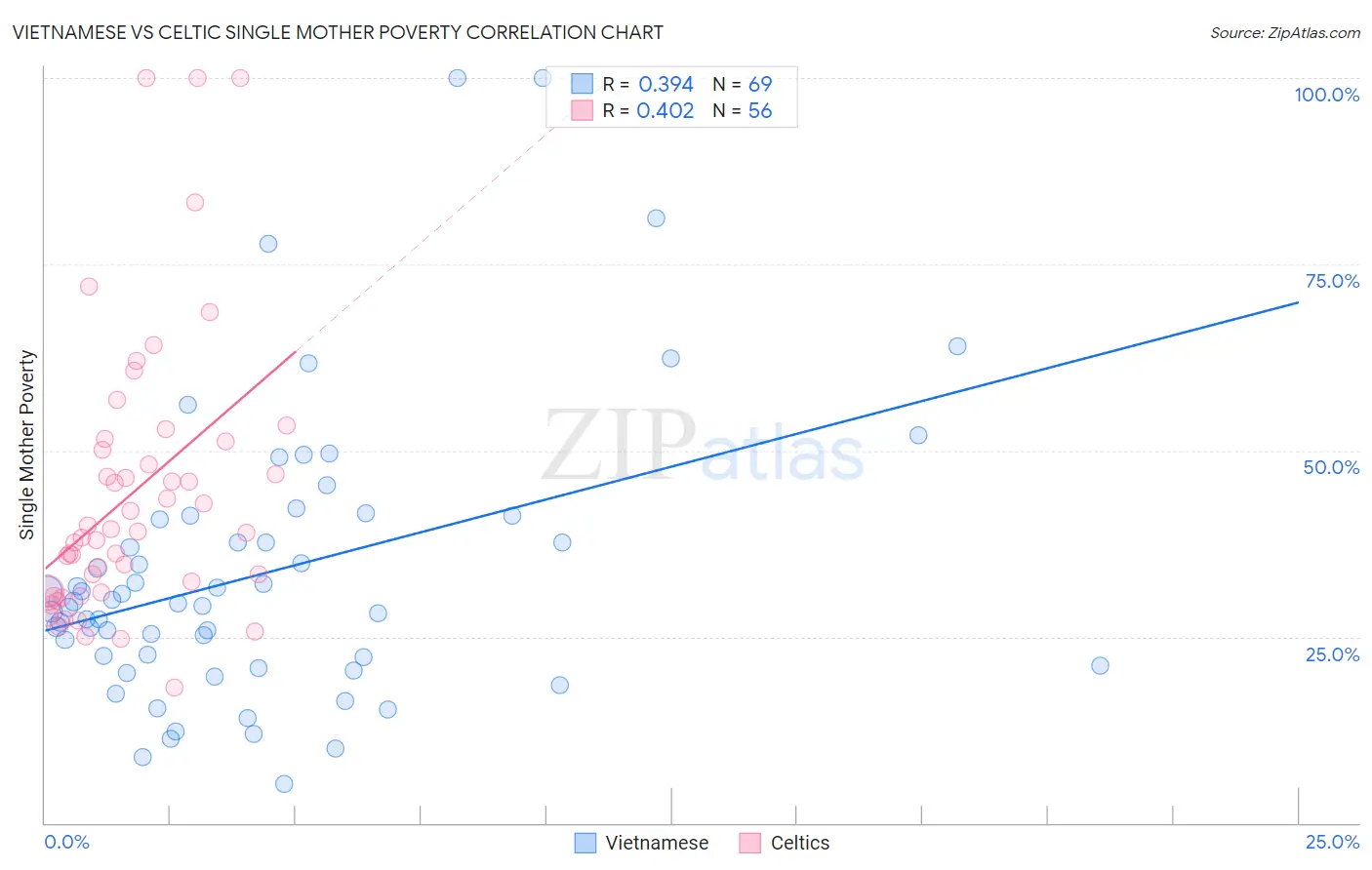 Vietnamese vs Celtic Single Mother Poverty Correlation Chart