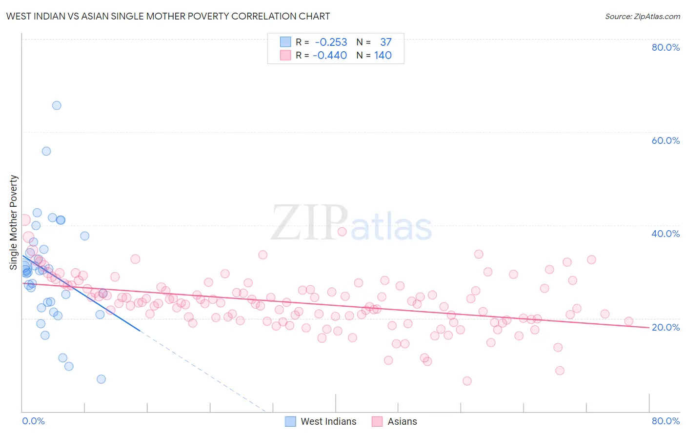 West Indian vs Asian Single Mother Poverty Correlation Chart