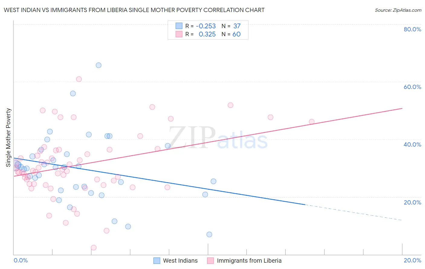 West Indian vs Immigrants from Liberia Single Mother Poverty Correlation Chart