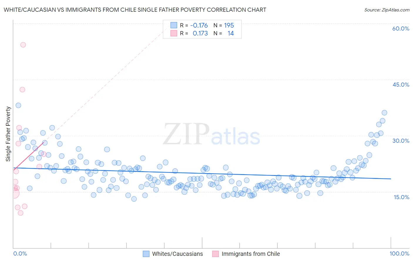 The statistical analysis conducted on geographies consisting of 414,032,364 people shows a poor negative correlation between the proportion of Whites/Caucasians and poverty level among single fathers in the United States with a correlation coefficient (R) of -0.176 and weighted average of 18.4%. Similarly, the statistical analysis conducted on geographies consisting of 186,328,392 people shows a poor positive correlation between the proportion of Immigrants from Chile and poverty level among single fathers in the United States with a correlation coefficient (R) of 0.173 and weighted average of 15.7%, a difference of 17.1%.